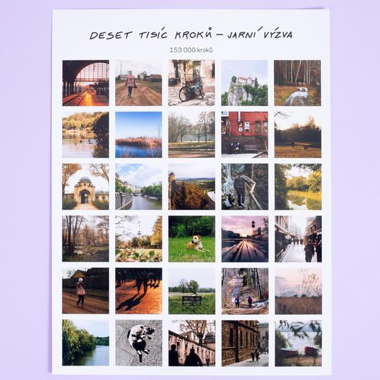 Všechny fotky z Kalendáře zážitků na jednom místě. Plakát s minimalistickým designem složený z vašich 30 snímků – s názvem výzvy a počtem nachozených kroků. Hezky vypadá doma i v kanceláři a je skvělým důkazem toho, co jste dokázali – ať už pro sebe, nebo pro celý tým.